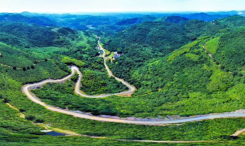 路若盤龍環(huán)戲水,雨灑叢林濕落花。